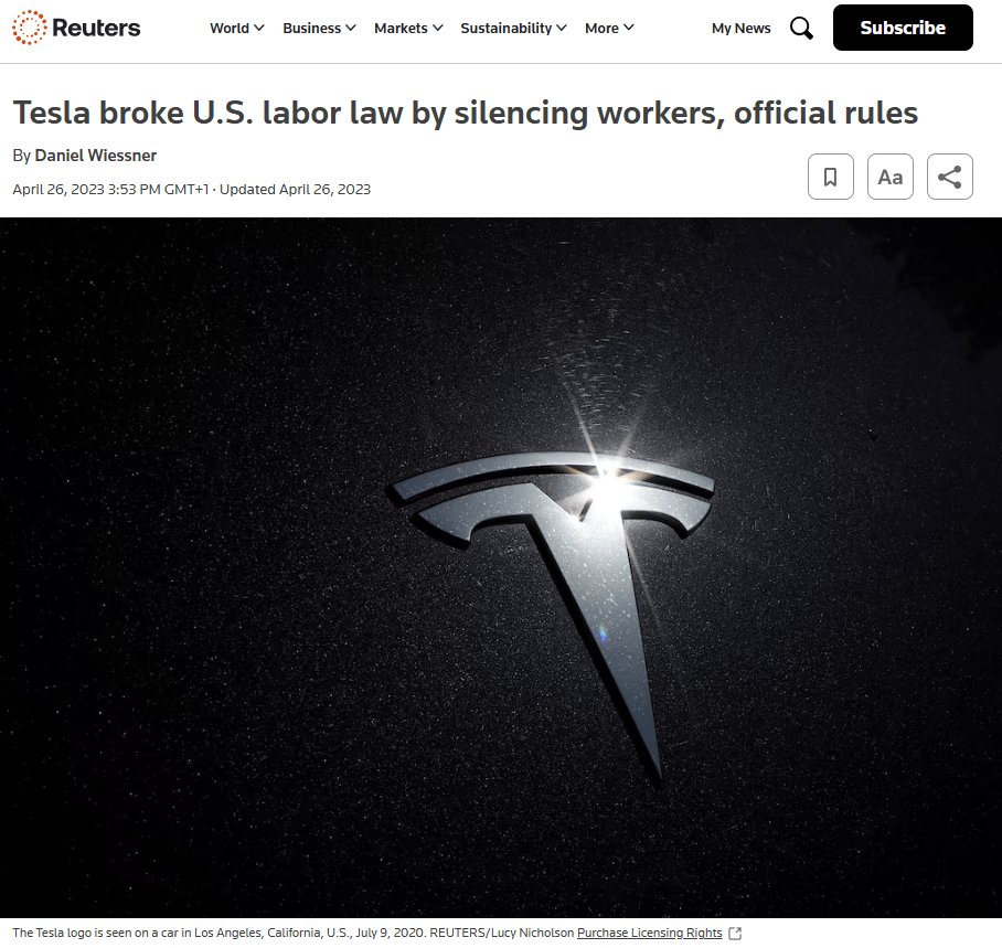 https://www.reuters.com/business/autos-transportation/tesla-broke-us-labor-law-by-silencing-workers-official-rules-2023-04-26/