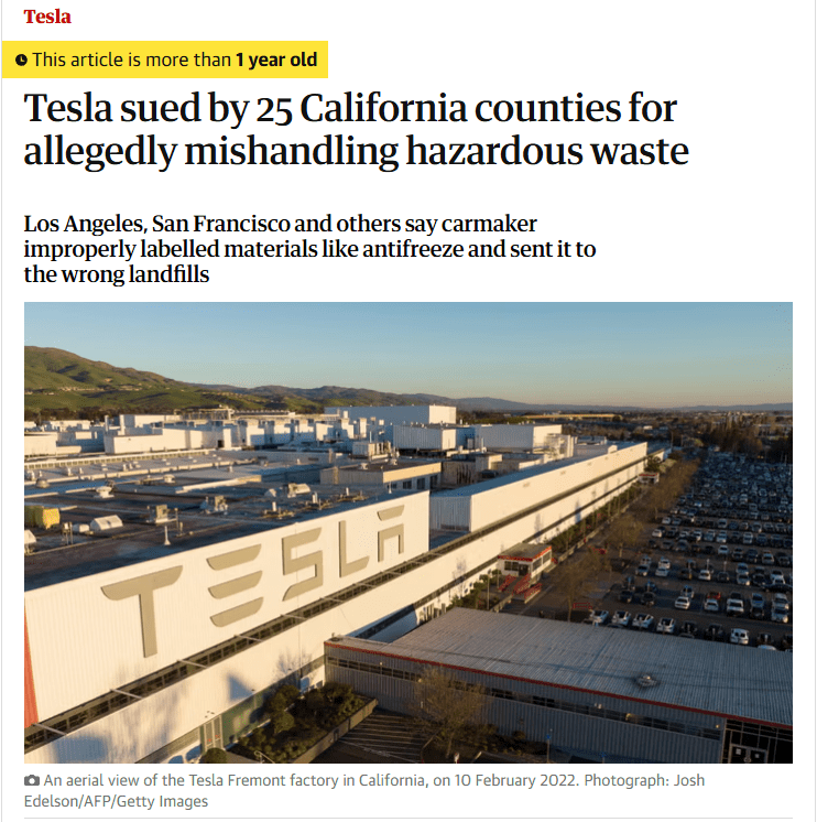 According to The Guardian, in 2024, Tesla was sued by a group of 25 California counties. These counties accused Tesla of labelling their waste improperly and then sending these materials to landfill sites that cannot accept hazardous material.